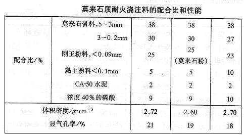 燒結(jié)或電熔莫來(lái)石熟料是優(yōu)質(zhì)耐火原材料之一,主要礦物成分為莫來(lái)石(含量95%左右) 和少量剛玉及玻璃相,化學(xué)成分為AL2O3 68%~75%,SiO2 23%~30% 。莫來(lái)石質(zhì)耐火澆注料的配合比和性能,(見(jiàn)下表),從表中看出,該澆注料性能優(yōu)良,黏土用量多,性能有所下降,一般以摻加5%為宜,實(shí)質(zhì)上是磷酸—粘土復(fù)合結(jié)合劑:另外,強(qiáng)度高和抗熱震性好是特色。