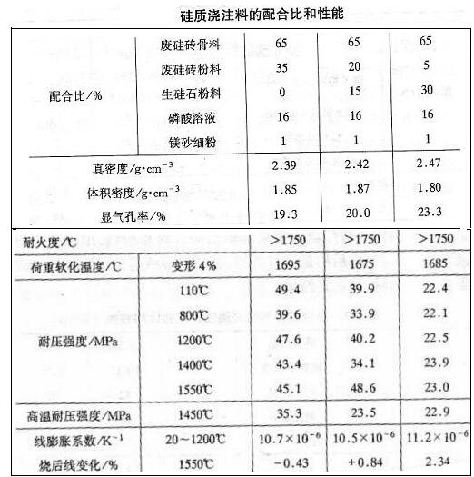 在配置硅質(zhì)耐火澆注料時(shí),主要用燒成硅磚或硅石,而生硅石和硅石粉用量不能太多。因?yàn)闊缶膨脹較大,影響澆注料的高溫性能。(以下表)為硅質(zhì)澆注料的配合比和性能。耐火骨料的顆粒級(jí)配為6~3mm,23% 3~1㎜,32%,1~0.5㎜,15%,0.5~0.1mm,30%:耐火粉料細(xì)度為小于0.09㎜:磷酸濃度為50%:鎂砂粉的細(xì)度為小于0.09㎜。