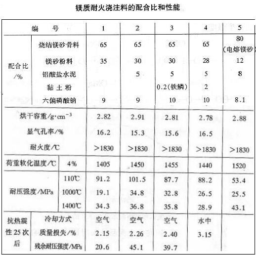 鎂質耐火澆注料通常采用燒結和電熔鎂砂作耐火骨料和粉料,其顆粒級配為5~2.5mm,33%:2.5~1.2mm,22%:1.2~0.6mm,25%:0.6~0.15mm,20%:,鎂砂粉細度為<0.09mm的大于85%:采用濃度為30%或當量濃度為4N的六偏磷酸納溶液拌和,待骨料表面全部濕潤后,再摻加耐火粉料,攪拌均勻,最后加剩余的六偏磷酸納溶液,繼續攪拌1~2min:震動成型后,自然養護3d,不得淋水。環境溫度不得低于10℃,越高越好。養護到期,作各種性能檢驗。(以下表)為鎂質耐火澆注料的配合比和性能。