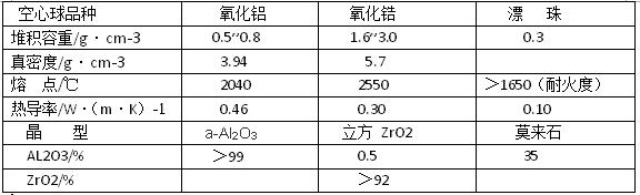 人造空心球品種有氧化鋁、氧化鋯、莫來石質(zhì)、鋁鎂質(zhì)和鎂鉻質(zhì)等,在耐火澆注料中應(yīng)用最多的為氧化鋁空心球:粉煤灰漂珠也是一種空心球,是由粉煤灰中提取的,是生產(chǎn)輕質(zhì)磚的良好原料,也是配制耐火澆注料的良好外加物。下表為空心球的主要性能。