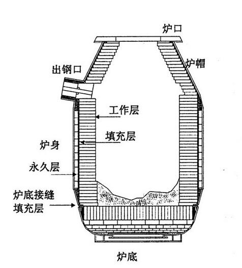 轉爐耐火材料爐襯結構可以分成爐底、熔池、爐壁、爐帽、渣線、耳軸、爐口、出鋼口、底吹供氣磚幾部分。