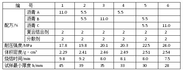 從表中看出,在鎂砂為85%、復(fù)合結(jié)合劑和分散劑分別為2%時(shí),隨著瀝青軟化溫度的降低,補(bǔ)爐料的體積密度和耐壓強(qiáng)度逐漸增加,燒結(jié)時(shí)間縮短,鋪展性增大。這些特性對補(bǔ)爐料是有利的:試樣最小厚度也隨瀝青軟化溫度的降低而減小,這是不利的。因?yàn)樵摮叽绱蠹囱a(bǔ)料層厚,有利于抗熔渣侵蝕和提高使用壽命,如編號1。編號1的其他性能不好,也影響使用:編號6的其他性能好,但其最小厚度小,也是不利的。同時(shí),軟化溫度低的瀝青,能較快的熔化并迅速形成致密炭化映客,阻礙了內(nèi)部瀝青揮發(fā)分的排除。該瀝青揮發(fā)分比較多,排除不暢,使補(bǔ)爐料形成夾層或貫通氣孔,將嚴(yán)重影響使用。綜合而言,編號4和編號5的補(bǔ)爐料較好。如果不考慮氣孔和夾層的影響,應(yīng)盡量采用軟化溫度低的瀝青做結(jié)合劑,配制新型補(bǔ)爐料。