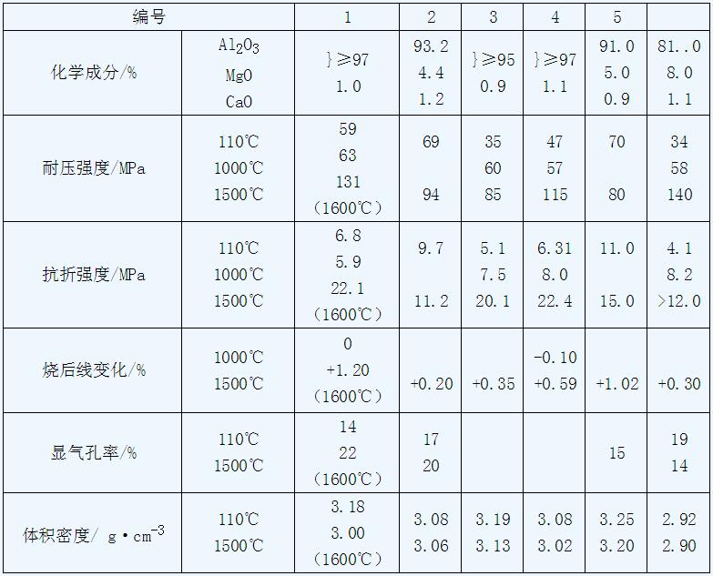 從表中看出,低水泥鋁鎂質(zhì)耐火澆注料的性能是優(yōu)良的。MgO含量不大于8%,與Al2O3 的含量為89% ~ 97.6%,說明材料優(yōu)良;燒后線變化均為正值,氣孔較低,強度較高,有利于澆注料的使用。