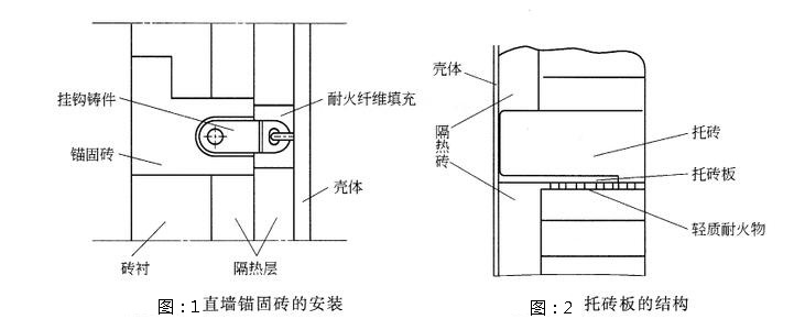 防止預(yù)熱器直筒的襯里與殼體脫開,需要在直墻內(nèi)安裝錨固件。即在殼體上裝錨固釘,錨固釘拴住埋設(shè)在墻中的錨固磚,錨固磚拉住了直墻。在直墻上, 描固磚每隔一定間距設(shè)置一組,使直墻和殼體牢固地粘接成一體。這就防止了直墻與殼體脫開,避免了發(fā)生塌落事故。錨固磚的安裝如圖1所示。