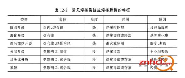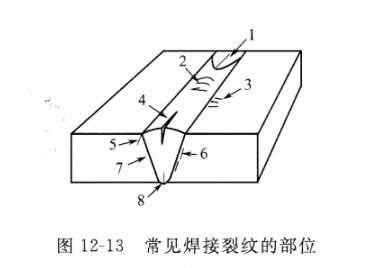 圖12-13顯示了常見焊接裂紋的部位。其中,發生在焊肉中的裂縫有1、2、4、8幾種;發生在熱影響區的裂縫有3、6兩種;7為焊縫的熔合線。 裂紋分為熱裂、冷裂兩種。一般情況下,熱裂為沿晶斷裂;冷裂為穿晶斷裂。熱裂發生在焊接過程或焊后的高溫使用過程,一般溫度髙于650°C;冷裂則出現在300°C:以下,不僅在焊接的冷卻過程中產生,也可在放置或使用中產生。常見焊接裂紋或焊接脆性的特征見表12-5。