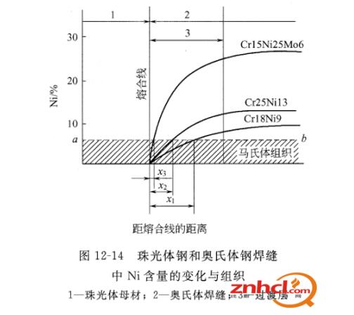 難點之二為,異種金屬的熱膨脹系數不同,容易引起熱應力且不易消除,往往產生很大焊接變形。因焊接應力和脆性的增加,異種鋼材的焊接接頭,尤其是熱影響區,容易開裂、脫落。圖12-14顯示了珠光體鋼和奧氏體鋼焊縫金屬中Ni含量的變化與組織。