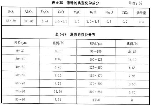 漂珠的化學(xué)成分隨發(fā)電用煤而波動(dòng)。一般情況下,漂珠的耐火度為1610〜 1700°C,粒度20〜250pm,比面積3000cm2/g,真密度2.1〜2.2g/cm3,堆積密 度250〜400kg,熱導(dǎo)率約0.6W/(m.K)。漂珠的典型化學(xué)成分見表6-28,參考 粒徑分布見表6-29。