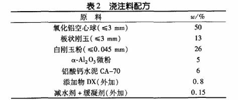 本試驗中還采用了一種多糖高聚物DX,它既可以改善澆注料漿體的流變特性,以提高澆注料的施工性能:又可以在熱處理過程中燒失,以增加澆注料基質中的微孔。