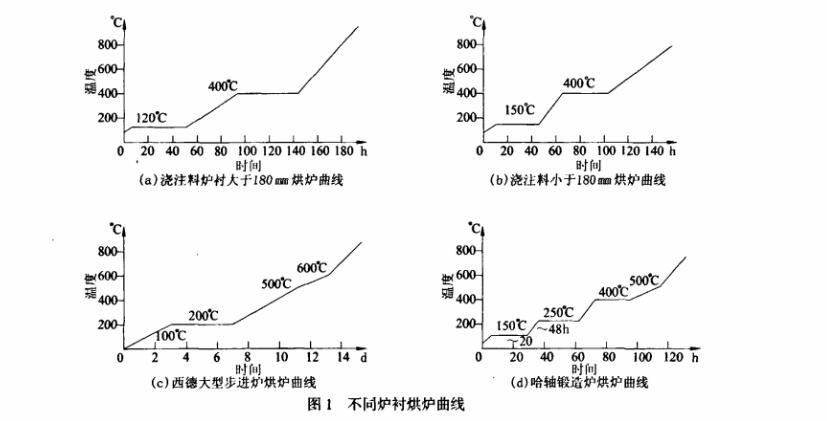 綜上所述,要避免爐襯彭烈及爆炸現象,就必須根據爐襯結構特點和耐火材料的性質、爐襯厚度、施工部位、成型工藝和烘爐方式制定科學的烘爐曲線,見下圖1.當爐襯結構既采用耐火磚又有澆注料做內襯時,要根據材質的特點、時間與溫度關系制定烘爐曲線,同時也應考慮澆注料水分的含量多少、施工季節、常溫強度、脫模后的自然養護時間等具體情況。烘爐時要嚴格執行烘爐曲線,確保爐襯中的水份順利排出,同時使爐襯經過高溫完成澆注料體的燒結。通過烘爐燒結使低強度的爐襯燒結完成一個具有理化性能高、堅實致密、無縫的整體爐襯,達到經久耐用、高溫長壽的目的。
