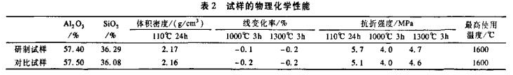 燒后線變化率系指試樣在規(guī)定溫度下加熱一定時間后的長度不可逆變化量與加熱前其長度之比,以百分率表示。若材料的線變化率過大,則對其襯體的破壞較大,易產(chǎn)生結(jié)構(gòu)剝落,降低其使用壽命。見表2.有表2可知,研制的新型耐火澆注料與進口耐火澆注料具有相近的燒后線變化率,1300X3h燒后均為-0.2%。分析原因,主要是原料中骨料均為優(yōu)質(zhì)的焦寶石,雜質(zhì)含量小,耐火度高,故燒后線變化小:再則基質(zhì)中添加有AL2O3,在耐火澆注料的使用過程中,AL2O3SiO反應(yīng)生成莫來石,莫來石的反應(yīng)會產(chǎn)生一定的體積膨脹,補償了澆注料在高溫下的部分收縮,這樣就減小了澆注料在高溫下的收縮,從而改善了耐火澆注料在高溫下的體積穩(wěn)定性。