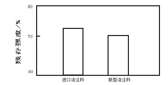 熱震穩(wěn)定性能使指耐火材料抵抗溫度急劇變化而不被破壞的能力,其評價方法有水冷熱震法,殘存強度百分率等。本實驗采用殘存強度百分率來評價耐火材料熱震穩(wěn)定性,研制的耐火澆注料與進口耐火澆注料的殘存強度百分率見圖1.由圖1可知,研制的新型耐火澆注料的熱震穩(wěn)定性能與進口澆注料的熱震穩(wěn)定性能相近。分析原因,主要是原料中骨料為優(yōu)質(zhì)焦寶石,基質(zhì)為莫來石礦相組成。焦寶石與莫來石的熱膨脹系數(shù)不同:且莫來石為針狀結(jié)晶,相互交錯,具有良好的強度與熱震穩(wěn)定性能。同時基質(zhì)中添加有AL2O3,在澆注料的使用過程中,AL2O3SiO2反應(yīng)生成莫來石,莫來石的反應(yīng)不僅增強了材料的強度,也改善了材料的熱震穩(wěn)定性能。