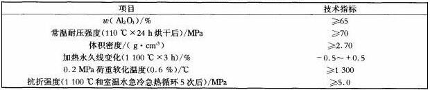 (2)物理性能。對于耐磨澆注料110℃X24h干燥后的體積密度比較接近單位體積實際材料需求量,規定活性石灰回轉窯耐磨澆注料的體積密度指標,保證澆注料具有較好的致密度,有利于抵抗窯內原料的磨損。由于活性石灰回轉窯的工作條件是原料在窯內從一端到另一端的轉動加滾動的過程,爐襯受到原料的沖擊與磨檫,承受著較高的物料負荷和熱負荷,必須保證窯襯耐磨澆注料具備一定的耐壓強度,從而確保產品具有良好的抗沖刷、磨損的能力。由于回轉窯窯頭和窯尾的溫差較大,最大約300~400℃,而且窯頭與下料口等部位的澆注料受冷熱交替作用產生熱應力,容易在其內部和表面產生裂紋,降低了澆注料的強度和耐腐蝕性,最終易導致爐襯澆注料的剝落和掉塊,從而影響了回轉窯的正常生產。可以通過活性石灰回轉窯耐磨澆注料的1100℃和室溫水急冷急熱循環5次后的常溫抗折強度指標來保證耐磨澆注料耐急冷急熱的熱震性,又能保證澆注料在受冷熱交替作用后的抗折強度,可保證澆注料在回轉窯工作溫度下旋轉運動狀態中的抗剪切破壞、抗剝落能力,確保爐襯在高溫條件下不崩塌、不剝落,保證使用的安全性。重燒線變化率、荷重軟化溫度應該控制在一個合適的范圍,前者決定膨脹縫的留法,保證施工體烘干后收縮小,避免與其他材質結合處出現裂紋而影響其使用效果,后者可以看出部分原料的優劣。