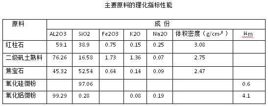 試驗原料用紅柱石、高鋁礬土熟料、焦寶石等主要原料的理化性能見表1,其中焦寶石為山西生產(chǎn),二級礬土熟料為河南當?shù)禺a(chǎn)品。