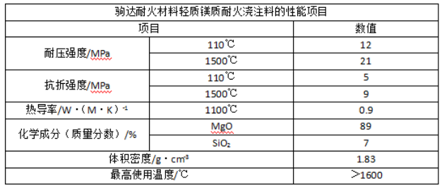 輕質鎂質耐火澆注料是以鎂砂顆粒料作為骨料,以鎂砂細粉作為粉料配制而成的輕質耐火澆注料。這類輕質耐火澆注料所用的結合劑主要選用CA-70C、CA-80C水泥、活性氧化鋁超微粉和二氧化硅超微粉或者兩者并用等。其性能如下: