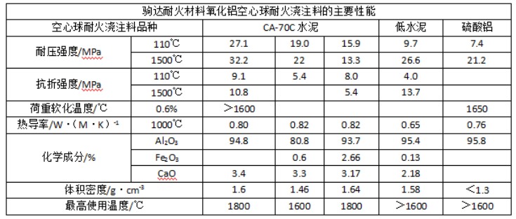 氧化鋁空心球耐火澆注料是以氧化鋁空心球作骨料,而以工業氧化鋁或者剛玉粉作為粉料所配制的輕質耐火澆注料。這類輕質耐火澆注料所用的結合劑主要選用CA-70C、CA-80C水泥、磷酸鋁和硫酸鋁等。澆注料中氧化鋁空心球骨料的最大粒徑為5mm,通常采用自然粒徑或者分級級配。同時還添加有外加劑或者外加物,以提高材料的性能。其性能如下: