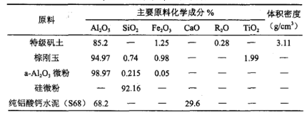 由于SiO2含量較高的材料容易與鋁及鋁合金發(fā)生反應(yīng),對這類耐火才老侵蝕嚴重,因此選用了Al2O3含量較高的一批材料,以提高澆注料的抗鋁水滲透能力。實驗主要原料:優(yōu)質(zhì)特級礬土、棕剛玉、α-Al2O3微粉、硅微粉、鋁酸鈣水泥、外加劑等。