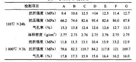 C、D兩組主要比較水泥量多少對強度指標的影響。通過大量實驗數(shù)據(jù)表明,常溫下試樣的強度主要由純鋁酸鈣水泥提供,水泥加入量越多則強度越高;但經(jīng)過高溫處理后,鋁酸鈣水泥加入量多的,燒后強度下降厲害;而加入量較少的,燒后強度則明顯提升。一般水泥加入量在7%左右為臨界點,少于7%的燒后強度一般為增加,高于7%時燒后強度則開始下降。綜合考慮施工因素,水泥量加入太低會影響脫模時間、脫模強度、常溫強度等,純鋁酸鈣水泥最終加入量確定為6%。