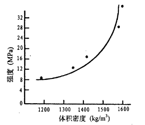 體積密度是輕質隔熱耐火澆注料的一項重要指標,對其它性能有很大的影響。輕質耐火澆注料的體積密度主要取決于所用輕骨料的體積密度。輕骨料的體積密度越小,由此所配制的輕質澆注料的體積密度也越小。此外,配料比例對輕質澆注料的體積密度也有影響,結合材料和細粉的用量越多,澆注料的體積密度越大。輕質隔熱耐火澆注料的體積密度與強度的關系如圖1所示,在骨料、膠結材料和摻和料相同的情況下,體積密度越大,強度越高.但會影響輕質澆注料的隔熱性能。此外,輕質骨料的強度也是影響輕質澆注料強度的重要因素