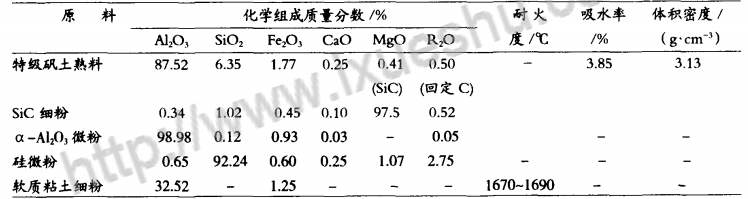 試驗用原料主要為山西陽泉特級高鋁礬土熟料和連云港SiC粉,并添加6%的開封純鋁酸鈣水泥結合劑,3%a-Al203微粉,1.5%的硅微粉和3%的軟質粘土。其中主要原料的理化指標見表1。