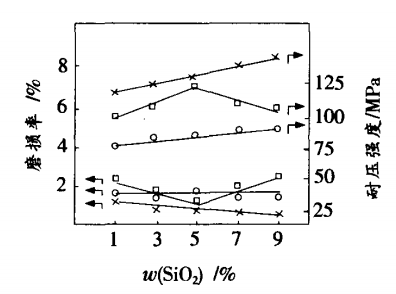 (2) 通過加入1.5%的減水劑可減少拌合水量,增加制品的密度,將耐磨性提高35%。