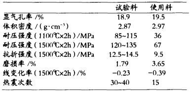 將試驗料和某廠使用的高鋁質耐磨澆注料進行性能測試,其結果見表3。
