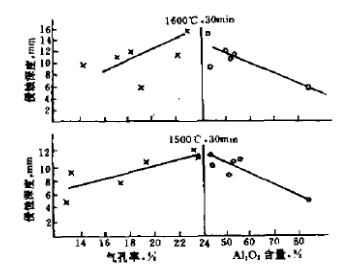 圖1 1500℃、1600℃時保溫30min的氣孔率,Al2O3含量與侵蝕深度的關(guān)系