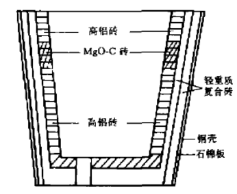 使用試驗在大冶鋼廠四煉鋼60t精煉包上進(jìn)行。鋼包外殼為Φ2700~Φ2970mm的圓錐體。工作襯渣線部位用MgO-C磚,鋼液部位用高鋁磚,有時也使用全MgO-C工作襯。復(fù)合保溫耐火磚襯砌于工作襯與鋼殼之間,代替原用的粘土質(zhì)永久襯,其軔筑情況見圖7。