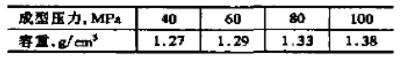由表1可以看出,成型壓力從40MPa增加到100MPa,容重增加0.lg/cm3左右。為了增加結(jié)合強度,調(diào)整添加劑加入量,采用80MPa壓力為宜。