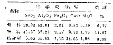 在各種原料確定的基礎上,輕質(zhì)澆注枓的強度是隨結(jié)合劑標號和用量的增加而提高的。但標號過高或用量過多不僅容重大,水化熱高,線收縮大,而且也不經(jīng)濟。為此選用500#礬土水泥作為結(jié)含劑,其化學成分見表2。
