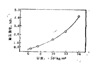 將試塊經(jīng)110℃干燥24小時后,測定其容重。并對骨料、結(jié)合劑、粉料成分相同而容重不同的試塊進行耐壓強度的測定。測定結(jié)果表明。在骨料、結(jié)含劑、粉料成分相同的條件下,試塊容重越大,耐壓強度越高,見圖1。