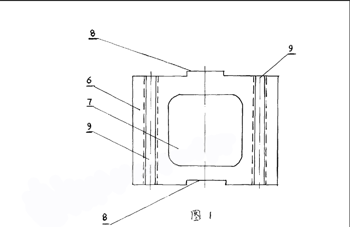圖1、2中,6—專用異型耐火磚的整體,7-異型磚整體6上的中心通孔,8—異型磚整體6外側面的凹槽、凸起,9—異型磚整體6上、下表面的凹槽、凸起。本實例在使用時可由數個專用異型磚的整休6通過其外側面的凹糟、凸起8相亙咬合物成導風 墻4 (附圖3中)的一層,再由若干專用異型磚的整體6通過其上、下表面的凹槽、凸起相互4合砌成導風墻4 (附圖3中)的若干層,這樣就徹筑成有數個導風孔的堅爐導風墻。