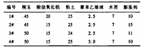 按表2中的配方進行配料。配料時,按比例將剛玉、氧化鋁、粘土、膨脹劑加入攪拌機內干混3~5min,然后加入可燃物及結合劑(外加),邊加入邊攪拌,混勻后出碾。