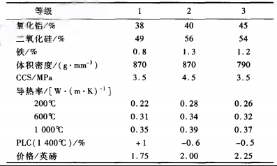 表2列出了3種隔熱磚類型。3類磚氧化鋁含量高,鐵含量低,密度小,看起來是最好的磚。1類和2類磚含量僅差2%,密度相同,1類磚導熱性較低。1類磚的PLC為+1%。