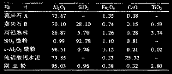 以莫來石礦物為主晶相的耐火材料具有極好的抗熱震性能,且高溫強(qiáng)度大,抗沖刷、耐磨損,體積穩(wěn)定性好。因此選擇莫來石為主要原料,同時(shí)選擇優(yōu)質(zhì)高鋁料、剛玉細(xì)粉、純鋁酸鈣水泥、超微粉及膨脹劑等為原料。原料化學(xué)成分見表1。