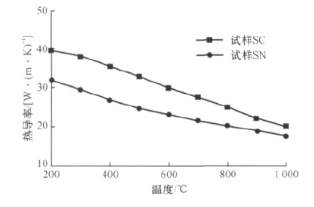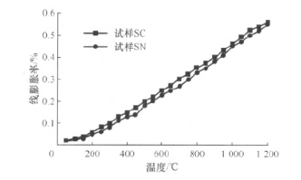 圖1比較了試樣SC和SN的線膨脹率,可以看出試樣SC的線膨脹率略高于試樣SN的。圖2比較了試樣SC和SN兩種材料的熱導(dǎo)率,可看出在600~1000℃范圍試樣SC的熱導(dǎo)率較試樣SN高約10%~25%,這對(duì)高爐中部?jī)?nèi)襯是有利的。