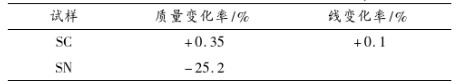將25mm×25mm×150mm的試樣在常溫下快速置入1350℃電爐內(nèi),保溫20min后迅速取出風(fēng)冷,強(qiáng)制風(fēng)冷至常溫,循環(huán)5次,測(cè)試試樣熱震前后的常溫抗折強(qiáng)度,比較不同試樣的抗折強(qiáng)度保持率,結(jié)果見(jiàn)表3。從結(jié)果看,風(fēng)冷熱震后,試樣SC的抗折強(qiáng)度保持率為正,而試樣SN為負(fù),表明試樣SC的抗熱震性能更優(yōu)。