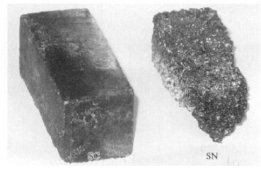 采用與GB/T14983-2008相近的試樣方法。將尺寸為25mm×25mm×70mm的試樣放入不銹鋼盒內(nèi),用無(wú)水K2CO3掩埋,在N2氣氛、930℃煅燒6h,N2氣氛下冷卻至常溫,在流動(dòng)的水槽中將試樣充分沖洗,在150℃干燥5h,測(cè)試樣侵蝕前后的質(zhì)量和尺寸的變化,試驗(yàn)結(jié)果見(jiàn)表2。圖3是熔堿侵蝕后試樣的外觀照片。可以看出;試樣SC侵蝕后棱角無(wú)缺損,表面平滑,表明K2CO3滲入材料內(nèi)部不多;而試樣SN侵蝕后棱角缺損嚴(yán)重,表面疏松,表明基質(zhì)侵蝕嚴(yán)重。所以,試樣SC表面取樣作XRD分析的結(jié)果看出,熔堿試驗(yàn)后,其物相組成與原樣基本一樣(見(jiàn)圖4),表明次試驗(yàn)條件下滲入的K2CO3少,K2CO3未與SiC發(fā)生明顯反應(yīng)。而試樣SN中的Si3N4與K2CO3發(fā)生了明顯反應(yīng)。而試樣SN中的Si3N4與K2CO3發(fā)生了明顯反應(yīng),生成低熔點(diǎn)的偏硅酸鉀和二硅酸鉀,使材料基質(zhì)遭受嚴(yán)重破壞。
