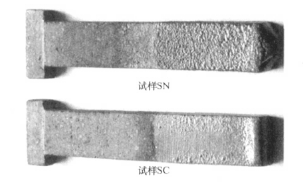 圖5為抗渣試驗(yàn)后試樣外觀照片。可以看出,肉眼觀察試樣SC和SN未見(jiàn)侵蝕,試樣SC表面附著很薄的一層渣,試樣SN表面的掛渣略多。圖6為試樣靠近渣面的SEM照片。可以看出,試樣SC表面輕微滲透,內(nèi)部與表面基質(zhì)均勻:試樣SN表面約為1mm的熔渣滲透層。