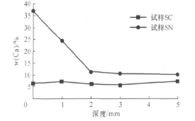 圖7 侵蝕后試樣表面到內(nèi)部基質(zhì)中Ca元素含量變化