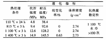 試樣常溫成型固化后經不同溫度熱處理后的強度、體積密度和線變化率見表1。
