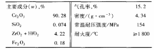 由于耐火磚中Cr2O3含量對抗熔渣的蝕損性非常關(guān)鍵,因而一般耐火磚型號均以Cr2O3的含量多少命名,煤氣化爐耐火磚的主要成分質(zhì)量組成及理化性能指標(biāo)如表1。