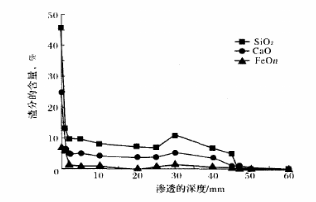 熔渣對耐火磚的其實(shí)主要包括3個(gè)過程,即滲透、溶解和沖蝕磨損。煤中含有的Si、Al、Ca、Fe及其他微量金屬鹽類構(gòu)成了煤的成分,不同的煤種可形成不同種類的熔渣,熔渣通過對磚的熔解、滲透并在氣化爐內(nèi)強(qiáng)還原氣氛下雨耐火磚的組分形成低熔點(diǎn)化合物,改變了磚的組成,低熔點(diǎn)化合物不斷地被沖刷,導(dǎo)致耐火磚被逐漸剝蝕。實(shí)踐證明,CaO含量高的熔渣在高溫下與其他組分發(fā)生程度不同的反應(yīng),形成新的低熔物相,較SiO2含量高的爐渣對Cr2O3基耐火材料的滲透侵蝕性更強(qiáng)(見圖2),引起的結(jié)構(gòu)剝落次數(shù)和厚度變化更加嚴(yán)重。