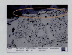 另外,CaO含量高的熔渣灰熔點(diǎn)低,操作過程中不易在磚面形成附著渣層,起不到以渣抗渣的作用,流動(dòng)熔渣在侵蝕滲透的同時(shí),還會(huì)直接沖蝕磚體,加速耐火磚的蝕損。圖3為煤氣化爐向火面高鉻磚運(yùn)行14000h后受高鈣熔渣侵蝕滲透狀況。