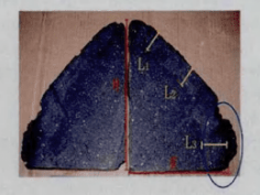 氣化爐緊急停車或發(fā)生操作故障時(shí),爐溫急劇變化,也是向火面磚產(chǎn)生裂紋的主要原因,這可能導(dǎo)致由于熱應(yīng)力而引起向火面磚出現(xiàn)大面積剝落,厚度可達(dá)5~30mm不等(見圖4)。隨著裂紋的產(chǎn)生和爐渣的滲透,在耐火材料表面形成滲透層,由于滲透層在膨脹系數(shù)等諸多理化性能與原耐火材料存在差異,在渣滲透帶和未滲透層之間也形成應(yīng)力,隨著溫度的變化,會(huì)出現(xiàn)整體剝落。