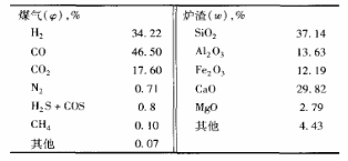 煤氣化爐操作條件為爐膛溫度不大于1400℃,操作壓力6.5MPa,煤漿濃度58%~64%,煤漿灰熔點(diǎn)小于1300℃,入爐煤量31.25t/h,排灰渣量4.2t/h。操作溫度控制在煤灰的灰熔點(diǎn)之上50℃,產(chǎn)生的渣呈液態(tài)沿耐火磚向火面留下,因而與耐火磚接觸的介質(zhì)為高溫煤氣的熔渣(組分見表2)。從熔渣組分可以看出,煤氣爐產(chǎn)生的熔渣為高鈣渣。
