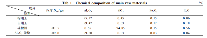 試驗原料有:電熔棕剛玉,白剛玉,97碳化硅,硅微粉(粒度分析D50<1.5um)、球瀝青(軟化點約為110℃)、高鋁水泥、98金屬硅粉(w(Si)=98.24%),活性Al2O3微粉(粒度分析D50<2um),碳化硼(w(B4C)=95.7%,粒度為325目),六偏磷酸鈉,其主要原料化學組成見表1。