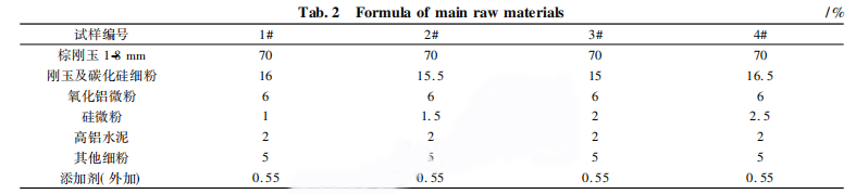 實驗中首先調整硅微粉加入量,加入質量分數分別為1%、1.5%、2%、2.5%,差值用剛玉粉彌補,試樣配比見表2。