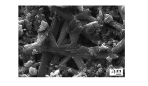通過選擇高強純鋁酸鈣水泥和高效減水劑等大量實驗,硅微粉1.5%和水泥1.5%組合時,常溫強度可達到50MPa以上,1450℃高溫冷態耐壓強度約90MPa,1450℃高溫抗折強度5MPa以上,對其熱態抗折強度試樣斷口進行電鏡分析:基質結構與晶相組成,與傳統配方相比,如圖3,發現試樣中形成發育良好的莫來石晶相,如圖4,從而顯著提高了試樣的熱態抗折強度。