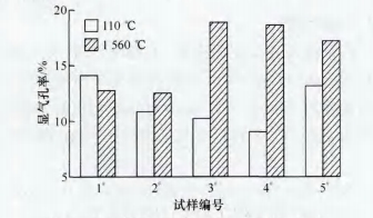 圖1示出了不同溫度處理后各試樣的顯氣孔率。從圖1可以看出,隨著水泥加入量的增加,110℃干燥后顯氣孔率略有降低,其原因為隨水泥加入量的增加其水化量也增加,而水泥水化是體積增加的反應,水泥水化體積增加從而填充了氣孔;隨水泥加入量、(w)從2%增加到6%,1560℃燒后試樣的顯氣孔率明顯增加,從12.5%增加到18.9%,水泥為6%(w)時顯氣孔率最大,繼續增大水泥加入量時,顯氣孔率略有降低。