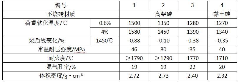 表1-1為硫酸鋁和水泥不燒磚的性能。編號(hào)1為硫酸鋁不燒磚,其耐火骨料和粉料分別為二級(jí)和一級(jí)礬土熟料制成;編號(hào)2用一級(jí)礬土熟料制作耐火骨料和粉料,用CA-70水泥作結(jié)合劑;編號(hào)3和編號(hào)4則用CA-50水泥作結(jié)合劑,耐火骨料分別為三級(jí)礬土熟料和一級(jí)黏土熟料,耐火粉料不燒磚應(yīng)自然養(yǎng)護(hù)3天,水泥不燒磚初凝后應(yīng)在潮濕環(huán)境中即淋水養(yǎng)護(hù)3天,然后送去烘干或直接筑爐。